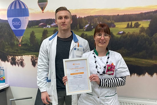 Vuokatin sivuapteekin puolesta tunnustuksen ottivat vastaan farmasian opiskelija Leo Vänskä ja farmaseutti Petra Liuski.