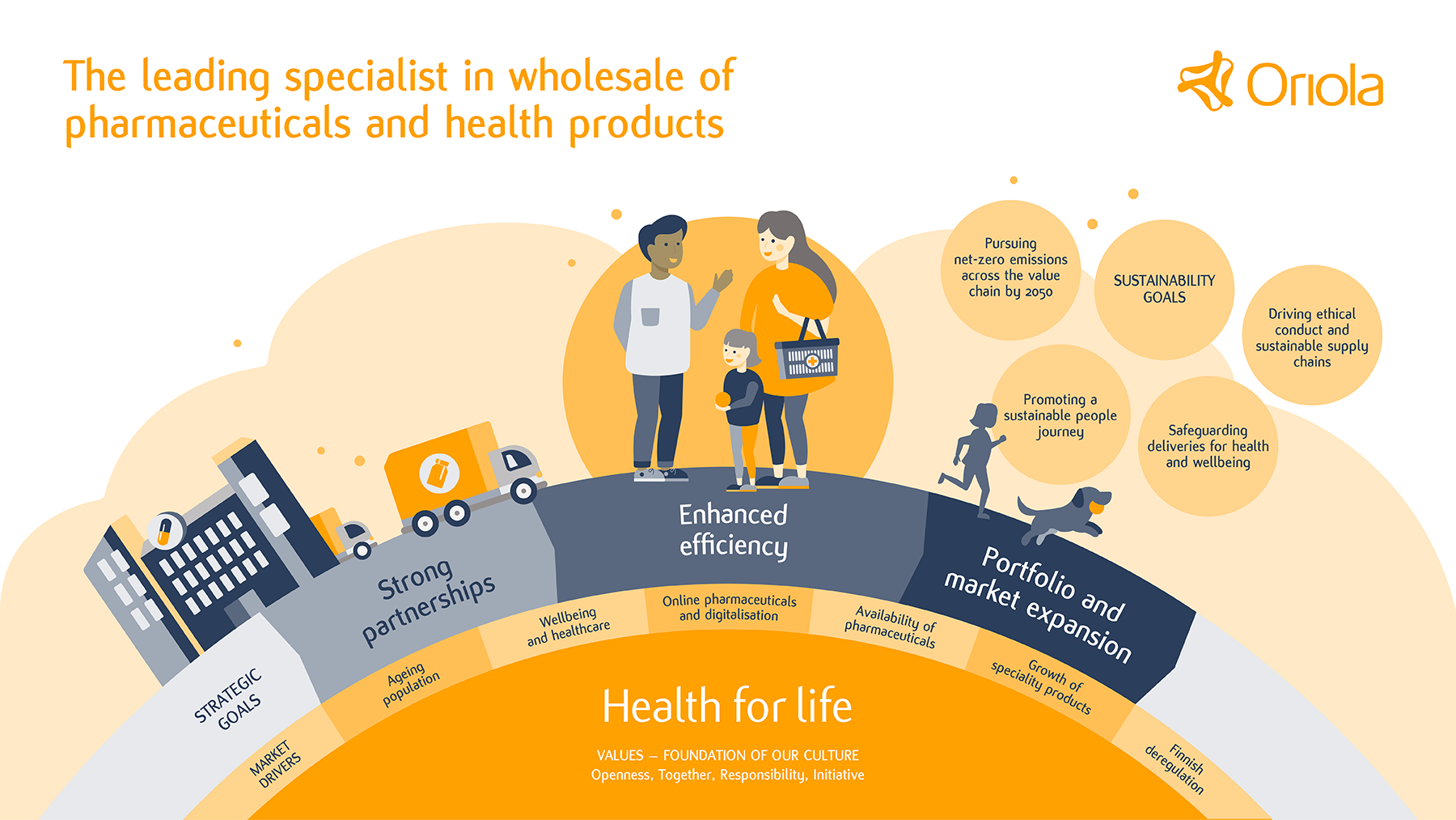 Oriola is taking the next steps to build the new Oriola by introducing a refined strategy with a strengthened focus on wholesale business. The strategy aims to capture the full value of Oriola's operations, strengthen its position in the markets and to create long-term shareholder value. With the strategy, Oriola enables health, every day, in accordance with the company vision.