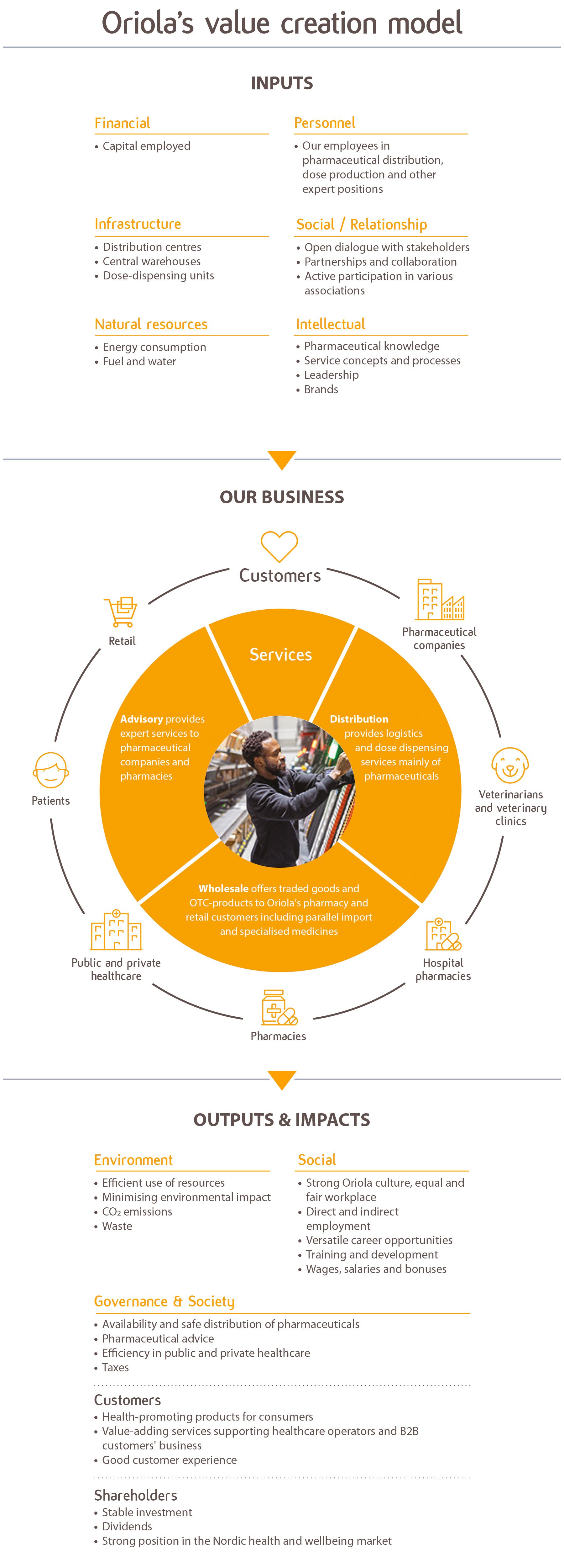 Our products and services create value for various stakeholders, from partners and employees to customers and shareholders. Oriola has a strong position in the Finnish and Swedish health and wellbeing markets. Our patient support and dose dispensing services promote the safe use of pharmaceuticals, and our extensive portfolio of health and wellbeing products supports health throughout life.
