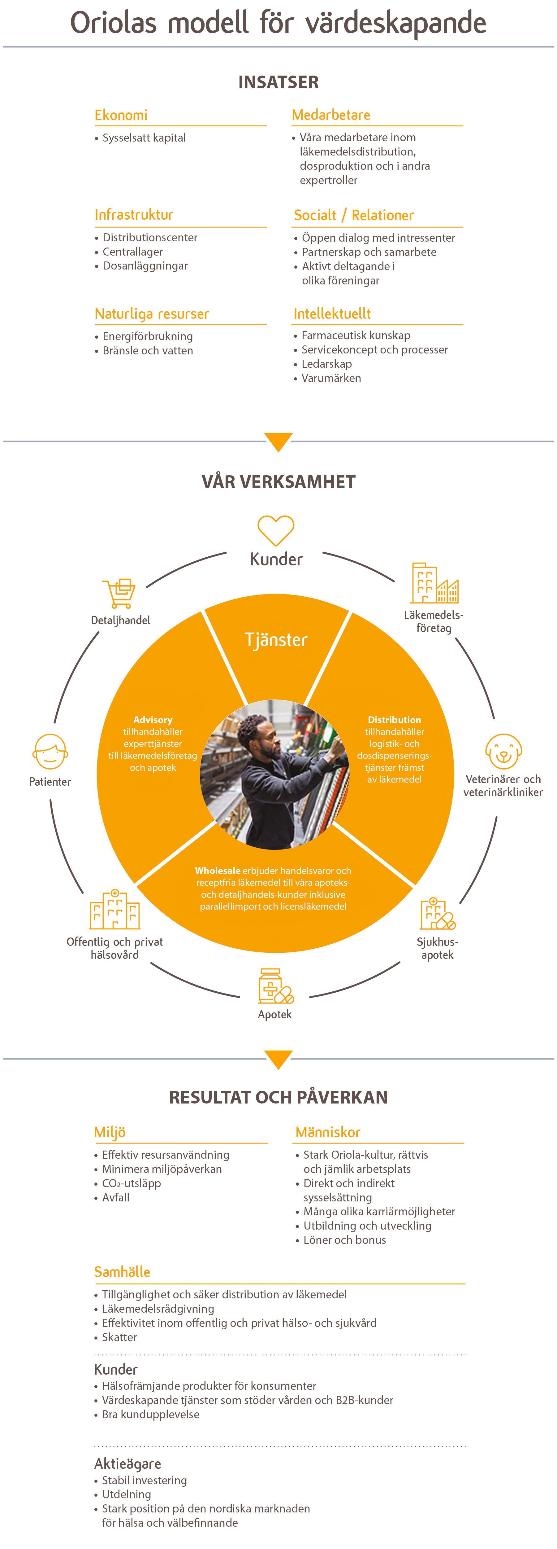 Våra produkter och tjänster skapar värde för olika intressenter, från partners och medarbetare till kunder och aktieägare. Oriola har en stark position på den finska och svenska marknaden för hälsa och välbefinnande. Våra tjänster för patientsupport och dosdispensering främjar säker användning av läkemedel; och vår omfattande portfölj av produkter för hälsa och välbefinnande främjar hälsa genom hela livet.