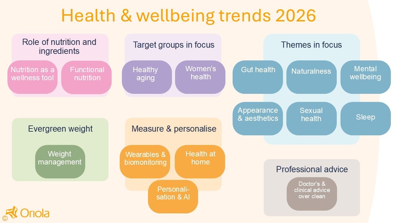 Hälsa och välbefinnande har varit en tydlig megatrend under flera år, och betydelsen fortsätter att öka. På de nordiska marknaderna är många konsumenter allt mer engagerade, pålästa och medvetna om hur de kan stötta sin hälsa genom hela livet. 2026 handlar välbefinnande om att göra medvetna val som kombinerar nutrition, förebyggande insatser, teknik och vägledning.